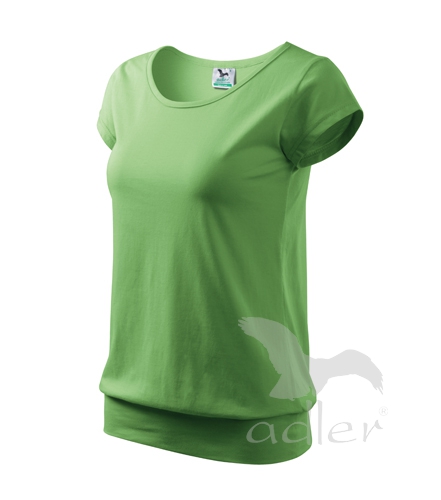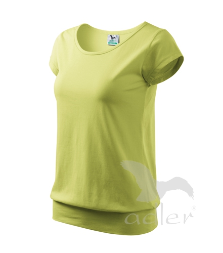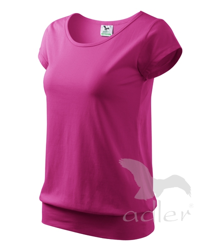 Tricou de dama, cu maneci foarte scurte, cu croiala lejera, cu margine lata in partea de jos. Guler rotund cu margine ingusta din acelasi material, banda de intarire la umerii. Lungimea tricoului este pana in dreptul soldurilor. Datorita finisarii cu silicon este moale si placut la atingere.