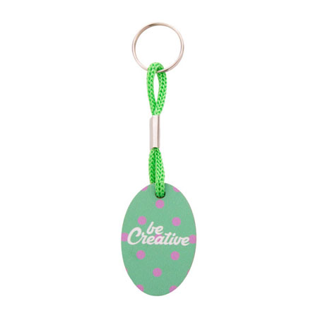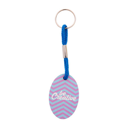 Breloc din placaj de mesteacan, in forma ovala, cu snur de poliester colorat si imprimare color. Pretul include imprimarea UV LED pe o parte. MOQ: 200 buc.