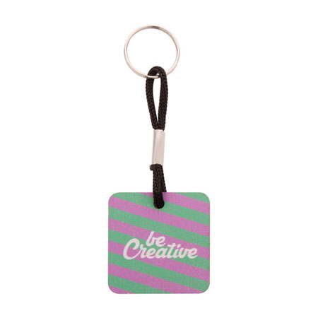 Breloc din placaj de mesteacan, in forma patrata, cu snur de poliester colorat si imprimare color. Pretul include imprimarea UV LED pe o parte. MOQ: 200 buc.