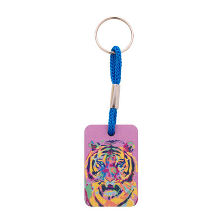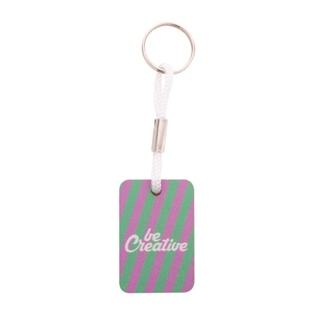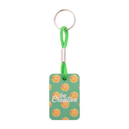 Breloc din placaj de mesteacan, in forma dreptunghiulara, cu snur de poliester colorat si imprimare color. Pretul include imprimarea UV LED pe o parte. MOQ: 200 buc.